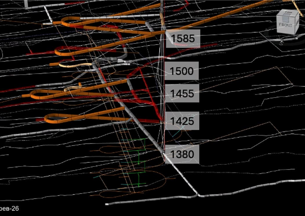 - Full mine layout (stopes, roads, ore passes, crushers, etc.)