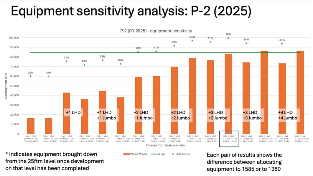 Equipment sensitivity testing showed that at least three additional LHDs were needed, alongside multiple jumbos, to approach feasibility. By the next year the plan improved, but production was still only achievable under specific equipment assignment strategies, particularly when LHDs were paired with trucks and allowed to dump into ore passes. The analysis confirmed that early-stage fleet competition and isolation, caused by unconnected levels, required both increased equipment and better coordination to avoid idle time and underperformance.