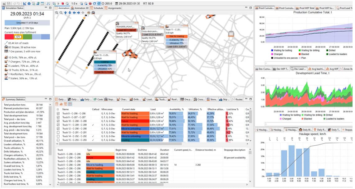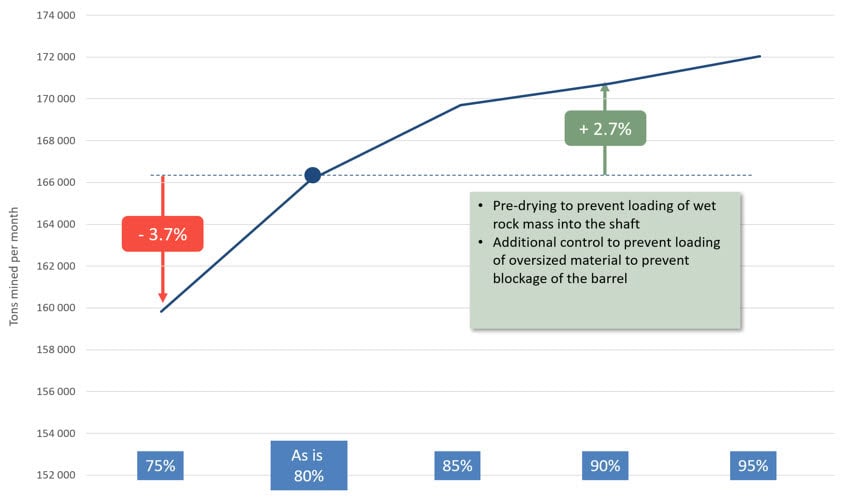 MineTwin simulations evaluated whether measures to increase shaft’s availability — from 80% to 95% — would effectively raise mine’s throughput. The model showed that at higher shaft availability levels, mine output could increase by up to 2.7%, confirming that the planned capacity upgrade was justified.