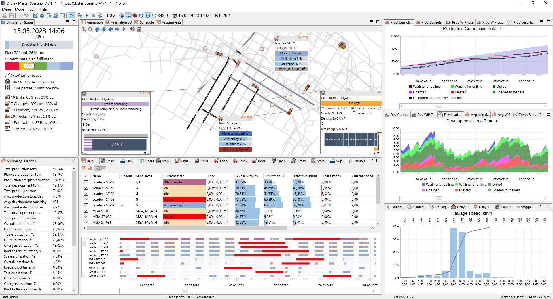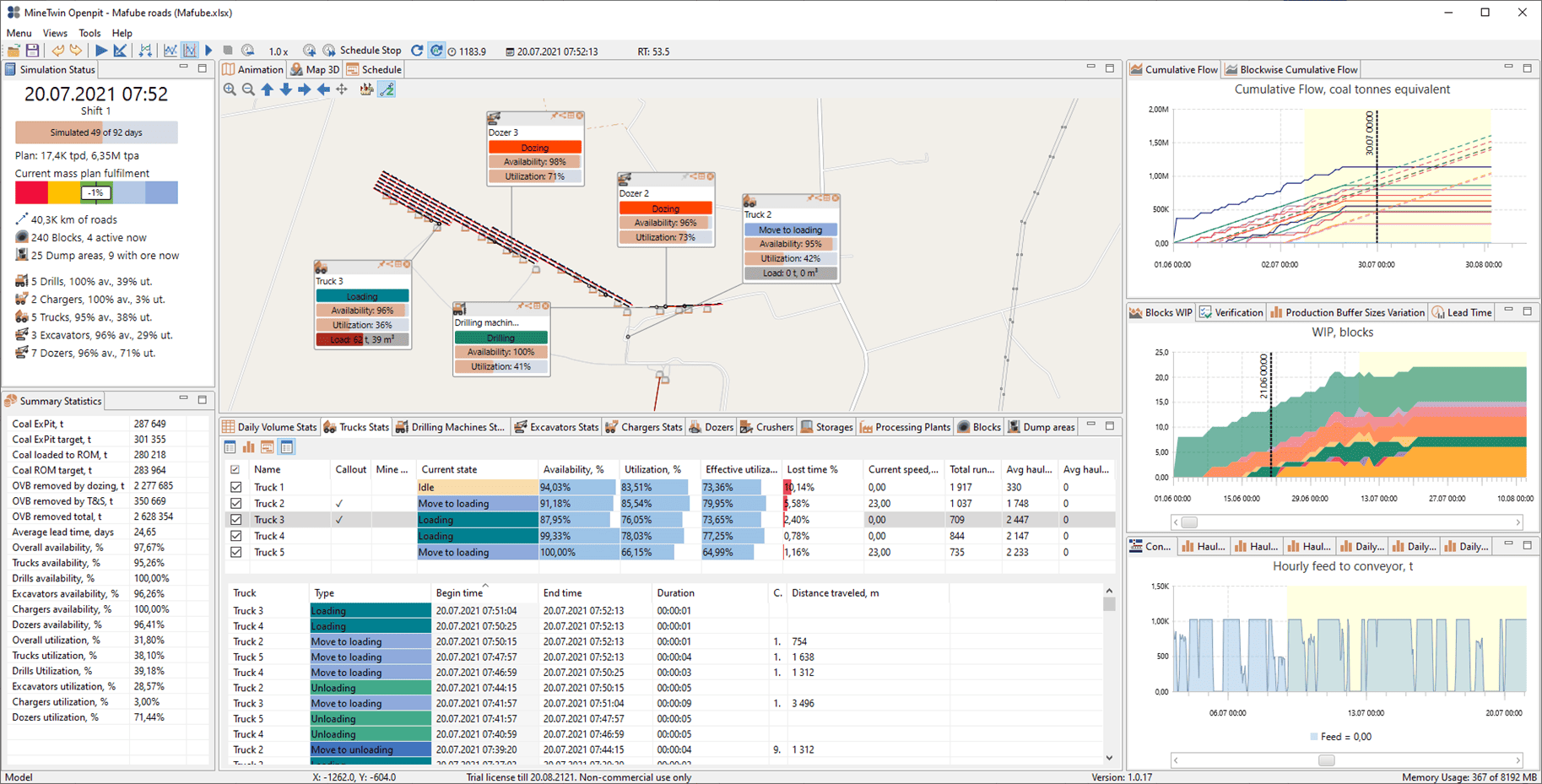The software provides a scenario management environment with 2D and 3D mine layout editors and data correctness checking simplifies data management and scenario building. MineTwin allows users to simulate years of mine operations within minutes on a regular PC. The simulation can be run with or without an interactive dynamic 2D and 3D animation. Switching off the animation allows to further accelerate the simulation and scenario analysis.