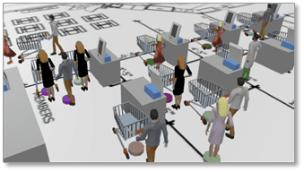 MOSIMTEC developed a flexible, AnyLogic simulation model to test various arrival patterns and volumes against different register arrangements and counts. The model allowed for multiple front-end layouts to be evaluated. The customers per group, cart sizes, and self versus staffed register preferences could all be varied in the model. The analysis was conducted with both historical data and anticipated future data profiles.